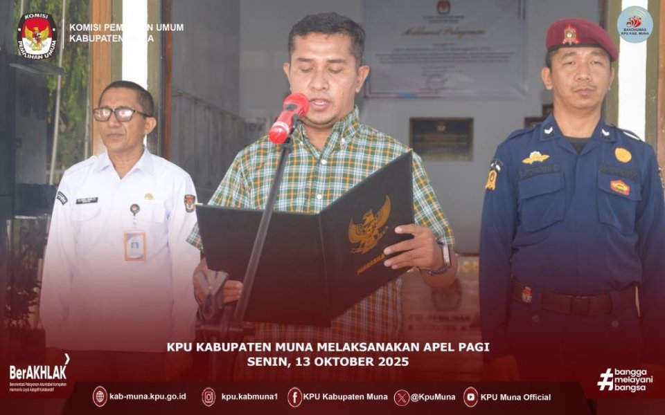 kab-muna.kpu.go.id - Raha. Jajaran Komisi Pemilihan Umum Kabupaten Muna melaksanakan Apel Pagi di halaman Kantor KPU Kabupaten Muna. Senin, 13 Oktober 2025.
