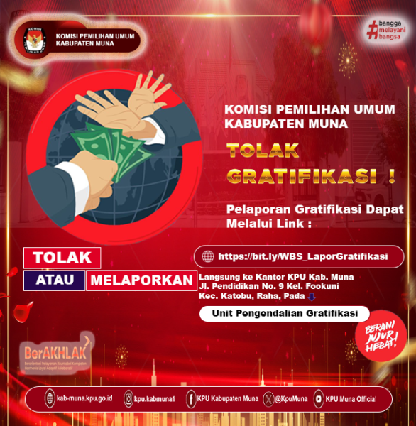 Sebagai bentuk komitmen dalam mewujudkan tata kelola pemerintahan yang bersih, transparan, dan berintegritas, KPU Kabupaten Muna menjalankan Pengendalian Gratifikasi sesuai dengan Peraturan KPU Nomor 15 Tahun 2015 tentang Pengendalian Gratifikasi di Lingkungan Komisi Pemilihan Umum.