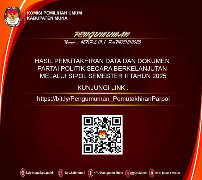 kab-muna.kpu.go.id. Raha - Komisi Pemilihan Umum Kabupaten Muna menerima hasil Pemutakhiran Data Partai Politik secara berkelanjutan melalui Sipol Semester II Tahun 2025 pada tanggal 29 Desember 2025. Data Partai Politik yang melakukan Pemutakhiran pada Semester II Tahun 2025 sebanyak 3 Partai dari 76 jumlah Partai Politik Nasional dan 16 Partai Politik Lokal Aceh. Ketiga Partai tersebut yaitu Partai Nasdem, Partai Keadilan Sejahtera (PKS) dan Partai BUlan Bintang (PBB).