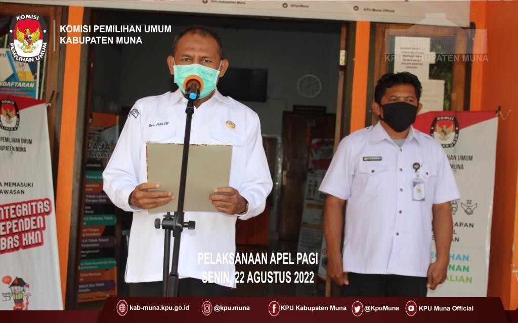 Pada apel pagi hari ini, Sekretaris KPU Muna, Halisi bertindak sebagai Pembina apel. Halisi Menyampaikan bahwa seluruh pegawai KPU Kab. Muna Harus tetap memperhatila kedisiplinan khususnya tentang kehadiran.