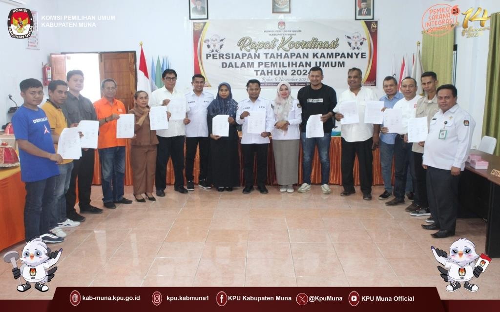 #TemanPemilih. Komisi Pemilihan Umum Kabupaten Muna melaksanakan Rapat Koordinasi bersama Bawaslu Kabupaten Muna dan Partai Politik Peserta Pemilu Tahun 2024. Rapat Koordinasi tersebut dalam rangka melakukan Paraf pada Dummy Surat Suara dan Penandatanganan Berita Acara Persetujuan Surat Suara Anggota DPRD Kabupaten Muna dalam Pemilu Tahun 2024. Pada Rakor itu juga dirangkaikan dengan Sosialisasi Peraturan KPU Nomor 15 Tahun 2023 tentang Kampanye Pemilu sebagaimana diubah dengan Peraturan KPU Nomor 20 tentang perubahan atas Peraturan KPU Nomor 15 Tahun 2023 dan Sosialisasi Peraturan KPU Nomor 18 Tahun 2023 tentang Dana Kampanye Pemilihan Umum. Rapat Koordinasi tersebut dihadiri oleh Plh. Ketua KPU Kab. Muna Kadiv Teknis Penyelenggaraan Pemilu, La Ode Ngkumabusi, Anggota KPU Kab. Muna Kadiv. Sosdiklih, Parmas dan SDM dan Kadiv. Perencanaan Data dan Informasi, serta Sekretaris KPU Kabupaten Muna dan Pimpinan Bawaslu Kabupaten Muna. Peserta Rapat Koordinasi tersebut yaitu Partai Politik Peserta Pemilu Tingkat Kabupaten Muna. Pada Rapat Koordinasi tersebut, Kadiv. Sosdiklih, Parmas dan SDM, La Tasman menjadi Narasumber dengan materi terkait Peraturan KPU Nomor 15 Tahun 2023 tentang Kampanye Pemilu dan Peraturan KPU Nomor 20 tentang perubahan atas Peraturan KPU Nomor 15 Tahun 2023 dan Kadiv. Teknis Penyelenggaraan Pemilu selaku Plh. Ketua KPU Kab. Muna, La Ode Ngkumabusi menjadi Narasumber dengan materi yang terkait Peraturan KPU Nomor 18 tahun 2023 tentang Dana Kampanye Pemilihan Umum, Rabu (15/11/2023). #KPUMelayani #PemiluSerentak2024
