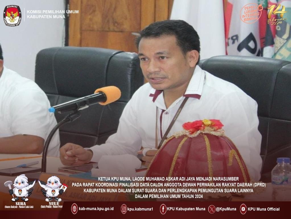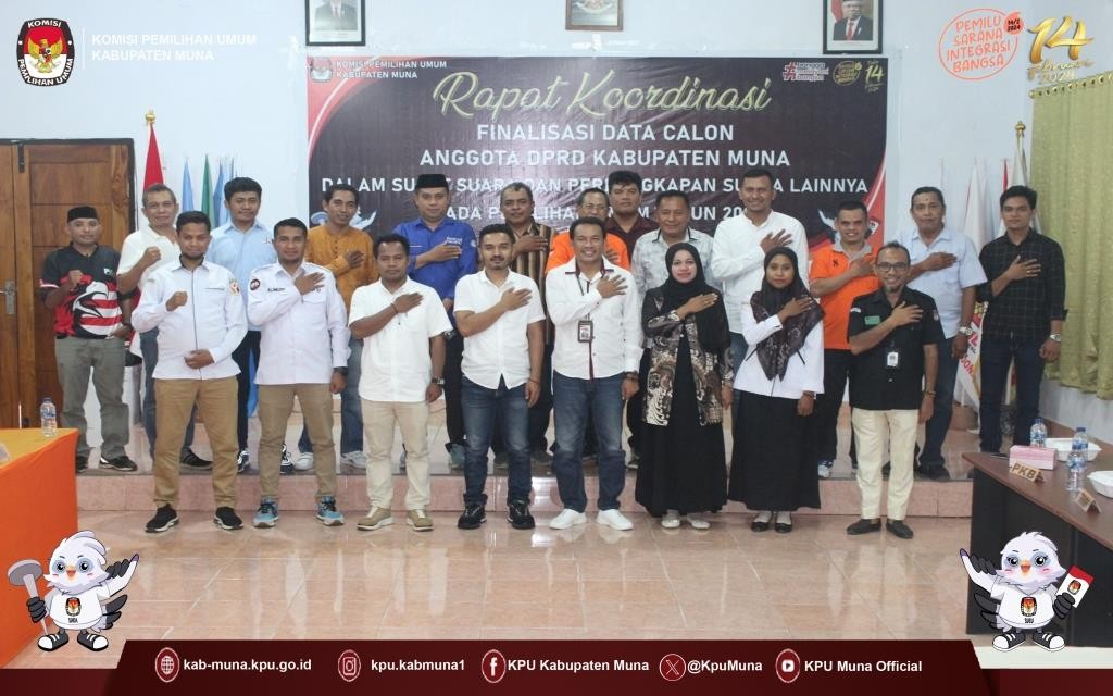 #TemanPemilih. KPU Kabupaten Muna telah melaksanakan Rapat Koordinasi Finalisasi Data Calon Anggota Dewan Perwakilan Rakyat Daerah (DPRD) Kabupaten Muna dalam Surat Suara dan Perlengkapan Pemungutan Suara Lainnya dalam Pemilihan Umum Tahun 2024. Rapat tersebut dihadiri oleh Ketua dan Anggota KPU Kabupaten Muna, Sekretaris KPU Kabupaten Muna, Ketua dan Anggota Bawaslu Kabupaten Muna. Peserta Rapat koordinasi itu adalah Ketua dan Sekretaris dan/atau LO Partai Politik Peserta Pemilu Tingkat Kabupaten Muna. Pada Rapat Koordinasi tersebut sebanyak 14 Partai Politik Peserta Pemilu yang turut hadir dan 4 (empat) Partai Politik tidak sempat menghadiri Rapat Koordinasi tersebut. Pada rapat tersebut, KPU Kabupaten Muna dan Partai Politik yang disaksikan oleh Bawaslu Kabupaten Muna menetapkan Finalisasi Data Calon Anggota DPRD Kabupaten Muna dalam Dummy Surat Suara dan diputuskan bahwa Data Calon dalam hal ini penulisan nama dan gelar tidak ada yang dilakukan perbaikan atau perubahan dalam Dummy Surat Suara. Penetapan tersebut tertuang dalam berita acara Nomor: 396/PL.01.4-BA/7403/2023. #KPUMelayani #PemiluSerentak2024