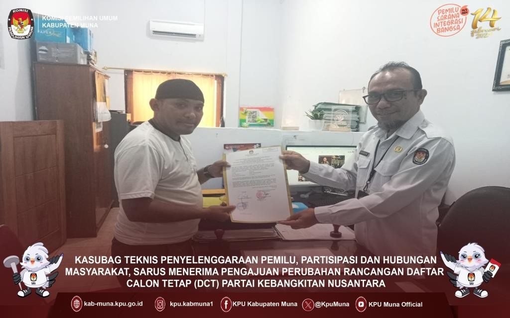 #TemanPemilih. Sesuai dengan Jadwal Tahapan Pencalonan Anggota DPRD Kabupaten Muna bahwa saat ini telah memasuki tahapan Pencermatan Rancangan Daftar Calon Tetap (DCT) Anggota DPRD Kab. Muna. Pada Masa pencermatan DCT ini, sesuai dengan Keputusan KPU Nomor : 1026 perubahan terhadap keputusan KPU Nomor 996 bahwa Parpol dapat melakukan pengajuan perubahan/perbaikan dan pergantian Calon sesuai dengan ketentuan yang telah ditetapkan pada keputusan KPU. Hari ini, Senin (02/10/2023), Partai Kebangkitan Nusantara (PKN) menjadi Partai Pertama yang mengajukan Perubahan Rancangan DCT di Kantor KPU Kabupaten Muna. Pada pengajuan tersebut PKN di wakili oleh Hizrah selaku LO Partai Kebangkitan Nusantara dan diterima langsung oleh Kasubag Teknis Penyelenggaraan Pemilu, Partisipasi dan Hubungan Masyarakat, Sarus. disela waktu pengajuan Perubahan DCT itu, Hizrah mengungkapkan bahwa di PKN tidak ada pergantian Calon dan tidak ada perubahan yang dilakukan. Perlu diketahui bahwa Pencermatan DCT ini dimulai sejak tanggal 24 September 2023 sampai dengan 03 Oktober 2023. #KPUMelayani #PemiluSerentak2024