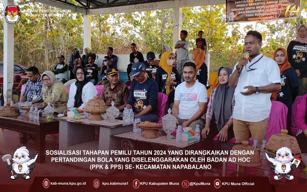 #TemanPemilih. Komisi Pemilihan Umum Kabupaten Muna menghadiri kegiatan sosialisasi yang diselenggarakan oleh Badan Ad Hoc (PPK dan PPS) se-Kecamatan Napabalano. Sosialisasi yang dilaksanakan dengan cara membagikan Brosur dan dirangkaian dengan pertandingan Bola.