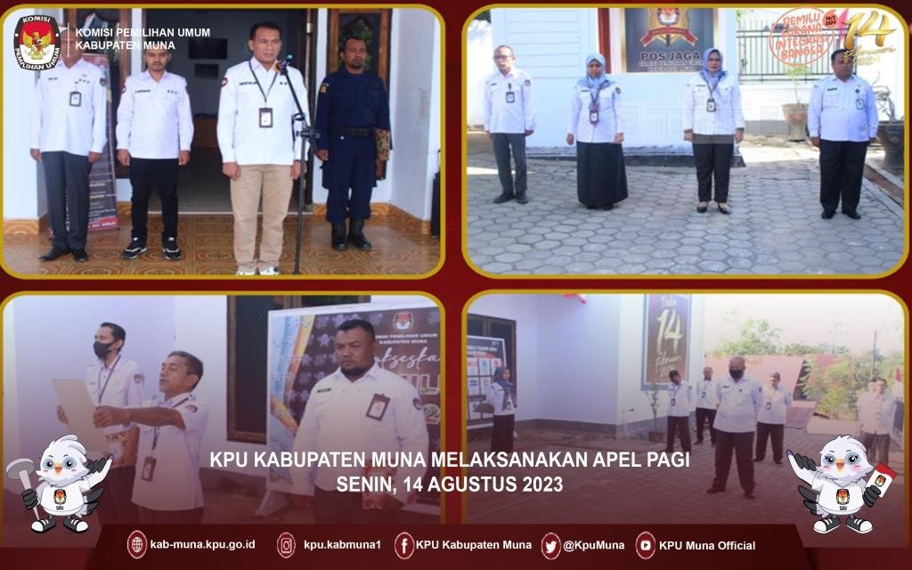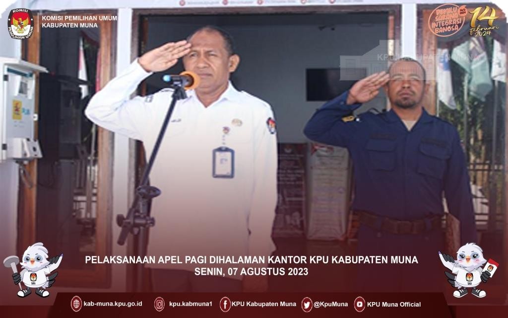Sebagai Pembina Apel, Ketua KPU Kab. Muna dalam pengarahannya menyampaikan beberapa hal diantaranya terkait kedisiplinan pegawai agar dipertahankan dan/atau ditingkatkan. Ketua KPU Muna juga menyampaikan terkait tahapan pemilu yang sedang berlangsung agar selalu memperhatikan proses pelaksanaannya dan tetap memperhatikan regulasi dari setiap tahapan Pemilu.
