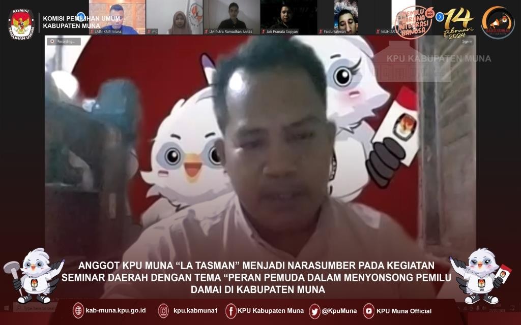 #TemanPemilih. Anggota KPU Kabupaten Muna La Tasman selaku Koordinator Divisi Sosialisasi, Pendidikan Pemilih, Partisipasi Masyarakat dan SDM Menjadi Narasumber pada kegiatan seminar daerah dengan tema “Peran Pemuda Dalam Menyonsong Pemilu Damai di Kabupaten Muna yang dilaksanakan oleh Kelompok Studi Mahasiswa (KOSMA) Katobu. Tasman menjelaskan paling tidak ada 6 hal yang dapat dilakukan pemuda dalam penyelenggaraan Pemilu 2024 yaitu Meningkatkan Partisipasi Pemilih, Menjaga Persatuan dan Kesatuan Bangsa, Mengawasi Jalannya Pemilu, Mengembangkan Kreatifitas dalam Kampanye Politik, Menghindari Politik Uang dan Politik Identitas dan Pemanfaatan Medsos Secara Bijak. Sementara itu untuk terciptanya Pemilu damai maka syaratnya adalah Peserta Pemilu termasuk Simpatisan Harus Siap Kalah dan Siap Menang, Penyelenggara Pemilu dan Pemerintah Harus Netral, Seluruh Stakeholders harus Menjaga Kondusifitas dan Terhindar dari Dampak Negatif Konten, Berita dan Informasi Hoaks, kata Tasman. Kegiatan Seminar tersebut dilaksanakan secara daring (Zoom Meeting).