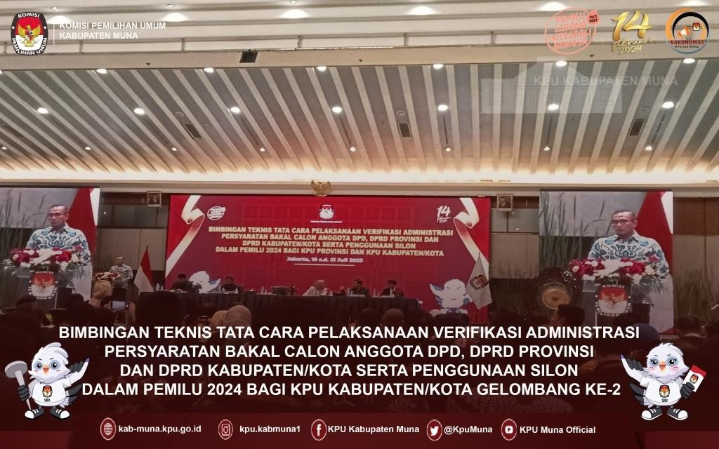 #TemanPemilih. Anggota KPU Muna Kordiv. Teknis Penyelenggaraan, La Ode Ngkumabusi Beserta Kasubag Teknis Penyelenggaraan, Partisipasi dan Hubungan Masyarakat, Sarus serta Operator Silon DPRD, Muhidin Mengikuti Bimbingan Teknis Tata Cara Pelaksanaan Verifikasi Administrasi Persyaratan Bakal Calon ANggota DPD, DPRD Provinsi dan DPRD Kabupaten/Kota serta Penggunaan Silon Dalam Pemilu 2024 Bagi KPU Kabupaten/Kota Gelombang ke-2. Kegiatan Bimbingan Teknis tersebut diselenggarakan pada tanggal 18 Juli sampai dengan tanggal 21 Juli 2023 bertempat di hotel Grand Sahid Jaya, Jakarta.