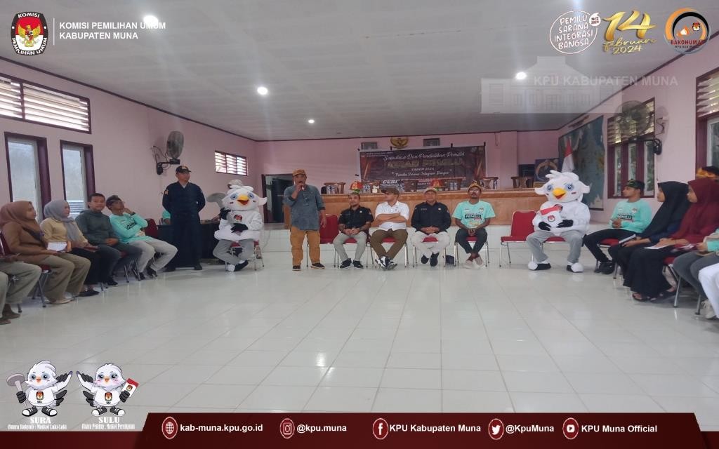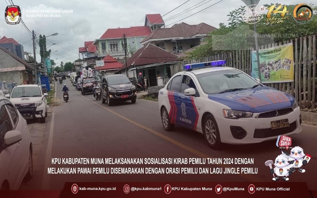 #TemanPemilih. Komisi Pemilihan Umum Kabupaten Muna Melaksanakan Sosialisasi Kirab Pemilu Tahun 2024 hari ke-6 (enam). Kegiatan sosialisai Kirab Pemilu Tahun 2024 pada hari ke-6 merupakan giat sosialisasi Road Show (Keliling) dengan nama “PAWAI Pemilu” (Perkenalkan Warga Ikut Pemilu). Giat Pawai Pemilu dimulai dari titik awal di Kantor KPU Kabupaten Muna pada Pukul 09.00 Wita, dimana tim sosialisasi kirab terdiri dari anggota KPU Prov. Sulawesi Tenggara ketua Divisi Parmas, Sosdikin dan SDM, Amirudin, S.Pt, Anggota KPU Kab. Muna Koordinator Divisi Perencanaan, Data dan Informasi, Yuliana Rita, Sekretaris KPU Kabupaten Muna Halisi serta Jajaran Sekretariat KPU Kabupaten Muna yang terdiri dari Kasubag, Staf dan Jagat Saksana KPU Kabupaten Muna Serta Siswa-Siswa SMK yang melaksanakan Praktek Kerja Industri (Prakerin) di Kantor KPU Kabupaten Muna serta PPK dan PPS se-Kec. Katobu, PPK dan PPS se-Kec. Batalaiwaru, PPK dan PPS se-Kec. Watopute, PPK dan PPS se-Kec. Duruka, PPK dan PPS se-Kec. Lasalepa, PPK dan PPS se-Kec. Napabalano, PPK dan PPS se-Kec. Watopute, PPK dan PPS se-Kec. Lohia, PPK dan PPS se-Kec. Kontunaga, PPK dan PPS se-Kec. Pasikolaga, PPK dan PPS se-Kec. Pasir Putih, PPK dan PPS se-Kec. Wakorumba Selatan, PPK dan PPS se-Kec. Batuka serta PPK dan PPS se-Kec. Maligano.