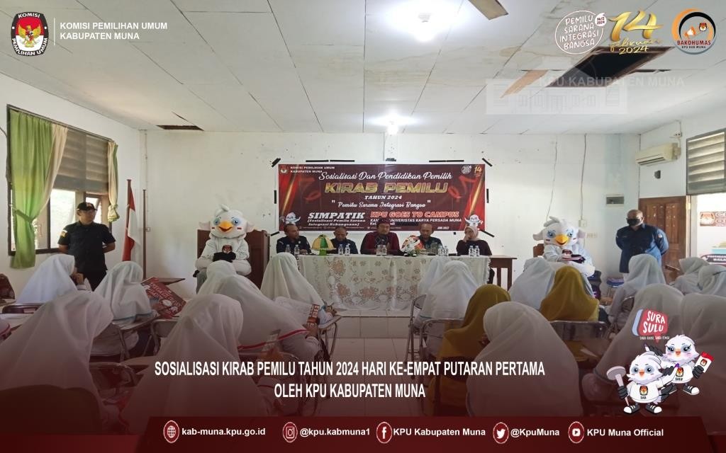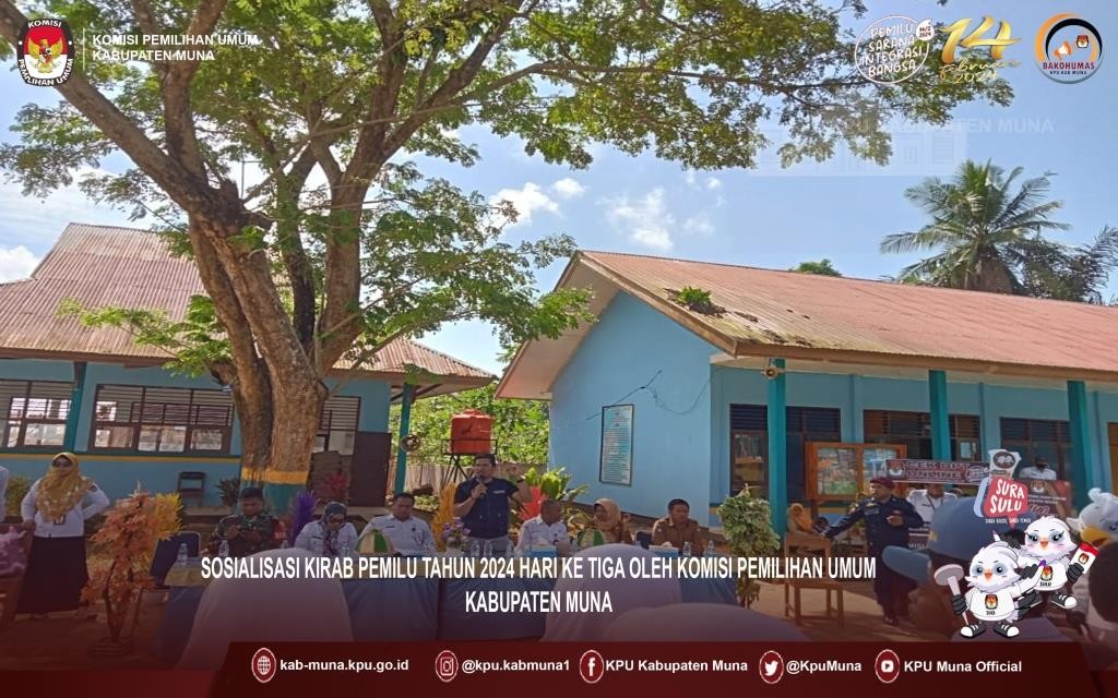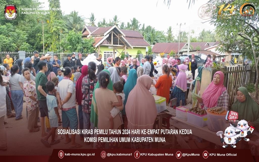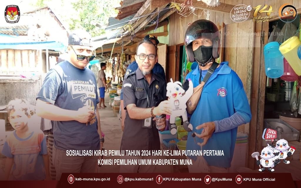 #TemanPemilih. Komisi Pemilihan Umum Kabupaten Muna Melaksanakan Sosialisasi Kirab Pemilu Tahun 2024 hari ke-Empat putaran Kedua. Kegiatan sosialisai Kirab Tahun 2024 pada putaran kedua dimulai dari titik awal di Kantor KPU Kabupaten Muna pada Pukul 15.50 Wita, dimana tim sosialisasi kirab terdiri dari Kasubag Teknis Penyelenggaraan Pemilu, Partisipasi dan Hubungan Masyarakat Sarus, SP didampingi Staf dan Jagat Saksana KPU Kabupaten Muna Serta Siswa-Siswa SMK yang melaksanakan Praktek Kerja Industri (Prakerin) di Kantor KPU Kabupaten Muna serta dibantu oleh PPK Kecamatan Lasalepa dan PPS se-Kecamatan Lasalepa. Kegiatan Sosialisasi Kirab Pemilu Putaran kedua merupakan Sosialisasi Road Show (Keliling) dengan Rute kegiatan Sosialisasi dimulai dari kantor KPU Kabupaten Muna menuju Kecamatan Lasalepa melalui Desa Lasalepa menuju Desa Parida Lanjut ke Desa Labunti menuju Desa Bonea Lanjut ke Desa Labone dan memutar di tugu Permandian Topa dan Kembali lagi menuju Kantor KPU Kabupaten Muna. Tim sosialisasi kirab berhenti di satu titik yaitu Pasar Cendana Desa Bonea Kec. Lasalepa. Sosialisasi Kirab Pemilu Tahun 2024 di Pasar Cendana Desa Bonea Kecamatan Lasalepa dimulai pada Pukul 16.30 Wita s.d 17.30 Wita. Kegiatan ini bertujuan untuk memberikan Informasi kepada Masyarakat sebagai Pemilih agar dapat menggunakan hak pilihnya pada tanggal 14 Februari 2024 dan sasaran giat yaitu Masayarakat di sekitaran Pasar Cendana Desa Bonea Kec. Lasalepa dan Pedagang. Narasumber kegiatan sosialisasi adalah dari Kasubag Teknis Penyelenggaraan Pemilu, Partisipasi dan Hubungan Masyarakat Sarus, SP. Acara Sosialisasi di isi dengan materi terkait tanggal Pemilu pada 14 Februari 2024, Daerah Pemilihan di Kabupaten Muna, cara cek DPT secara online, Jenis Surat Suara yang akan dipilih serta pengenalan nomor urut dan nama Partai Politik peserta Pemilu tahun 2024. Acara juga di isi dengan sesi kuis dimana para Peserta Sosialisasi yang menjawab pertanyaan dengan benar mendapatkan hadiah berupa , boneka Maskot Pemilu Sura dan Sulu. Tim Sosialisasi juga melakukan Pembagian Flayer dan Stiker Kepada Masyarakat. #KPUMelayani #PemiluSerentak2024