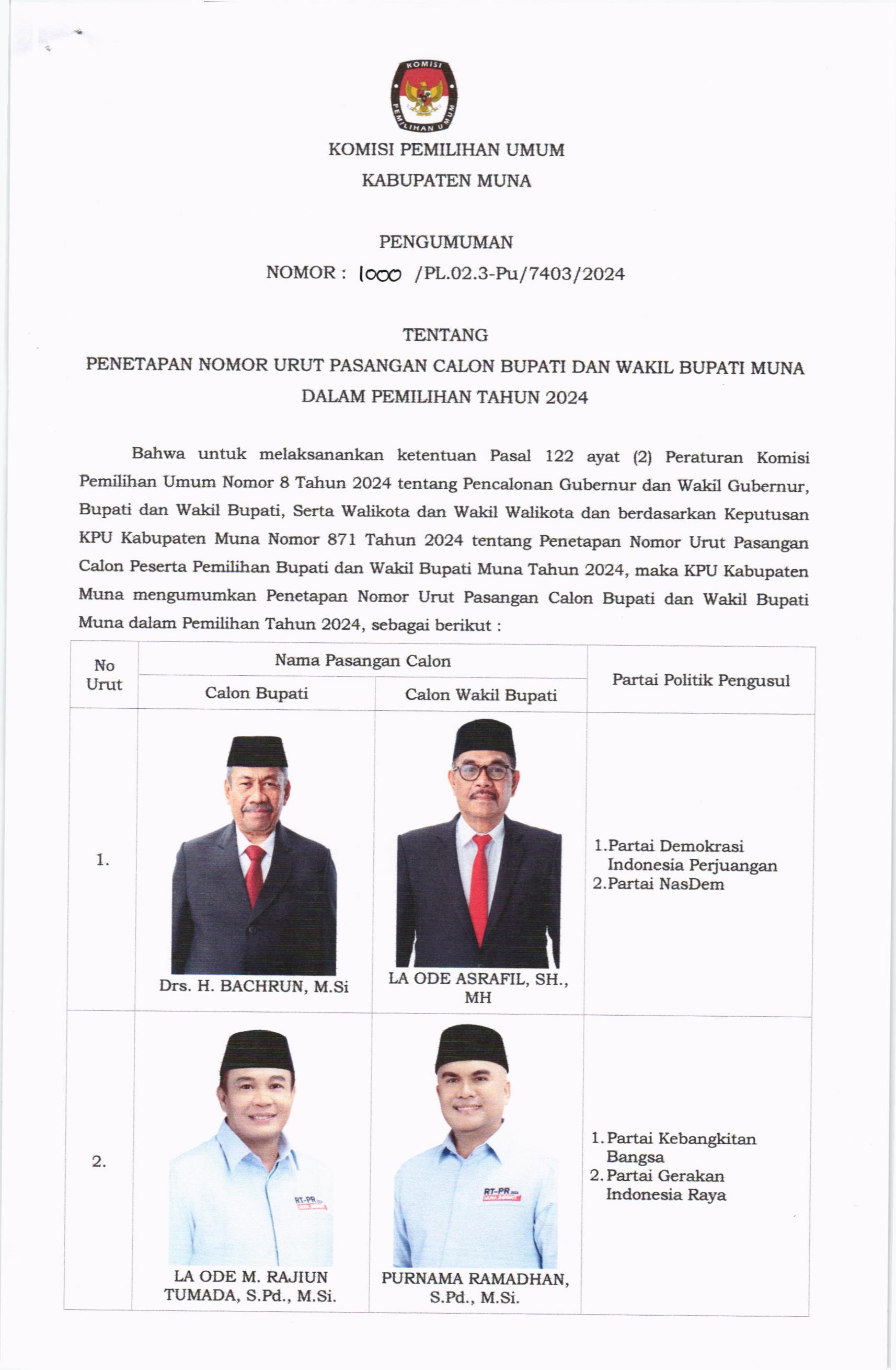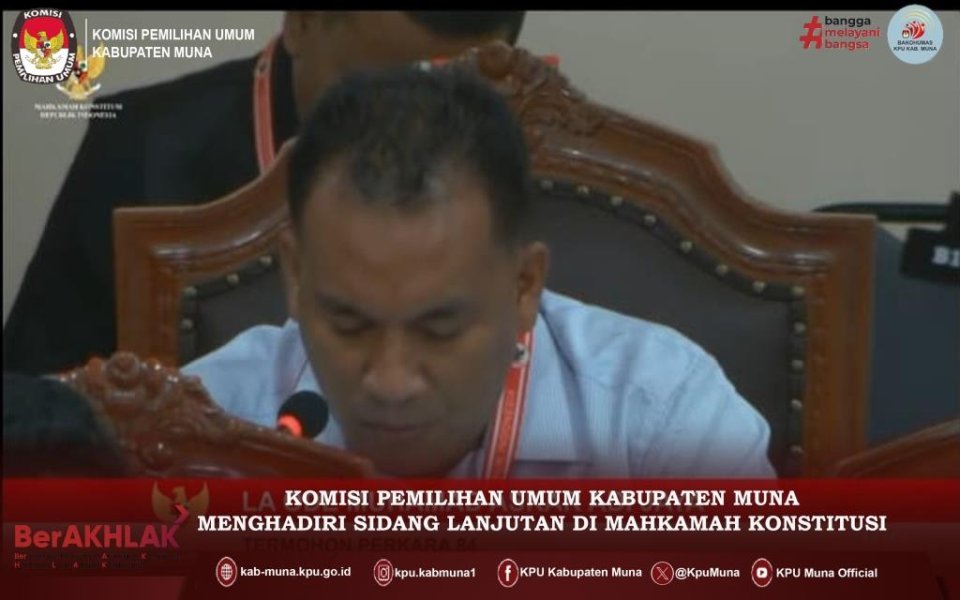 Raha - Komisi Pemilihan Umum (KPU) Kabupaten Muna menghadiri sidang lanjutan di Mahkamah Konstitusi (MK) dengan Perkara Nomor 84/PHPU.BUP-XXIII/2025 Perselisihan Hasil Pemilihan Umum (PHPU) Bupati dan Wakil Bupati Kabupaten Muna 2024. Persidangan digelar di Gedung II Mahkamah Konstitusi (MK) dengan agenda Mendengarkan Jawaban Termohon (KPU Kabupaten Muna), Keterangan Pihak Terkait (Paslon Nomor Urut 1 An. Dr.Bachrun, M.Si dan La Ode Asrafil, S.H., M.H) dan Bawaslu Kabupaten Muna, serta Pengesahan Alat Bukti Para Pihak, Jumat (24/1/2025). KPU Kabupaten Muna juga mengadiri persidangan sebelumnya yang digelar pada hari Rabu tanggal 15 Januari 2025 dengan agenda mendengarkan Permohonan Pemohon (Paslon Nomor Urut 2 An. La Ode M. Rajiun Tumada, S.Pd., M.Si dan Purnama Ramdhan, S.Pd., M.Si). Dalam persidangan tersebut Pemohon mendalilkan persoalan pengerahan aparatur sipil negara (ASN) dalam menggalang dukungan bagi Pihak Terkait. Pemohon juga mendalilkan bahwa Pihak Terkait telah memanfaatkan sejumlah program dan fasilitas Pemkab Muna pada masa kampanye. Kemudian penyelenggara pemilihan juga disebut Pemohon cenderung berpihak kepada Pihak Terkait, di antaranya tercermin baliho yang dicetak Termohon terdapat ajakan untuk memilih Pihak Terkait, juga buku visi-misi Pihak Terkait yang tersemat logo Pemkab Muna. Pada tanggal 14 Februari 2025, KPU Kabupaten Muna kembali mengkuti sidang lanjutan di MK baik secara Daring maupun secara luring dengan agenda Pembacaan Putusan Perkara Nomor 84/PHPU.BUP-XXIII/2025. Dalam persidangan tersebut, Mahkamah Konstitusi sebagai lembaga yang mengadili perkara konstitusi pada tingkat pertama dan terakhir “menyatakan permohonan Pemohon tidak dapat diterima”. #KPUMelayani