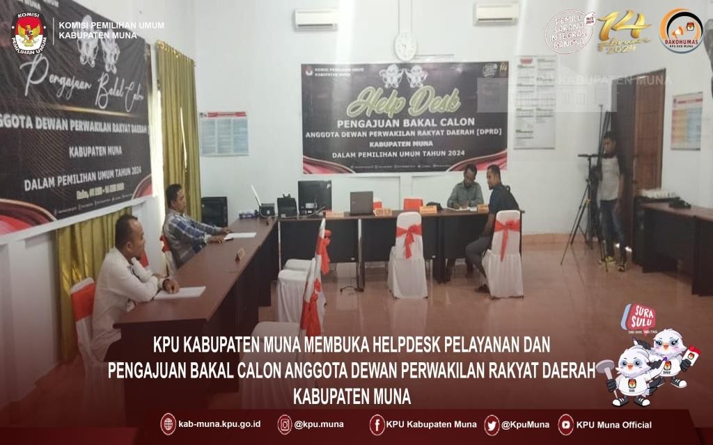 Koordinator divisi (kordiv) teknis dan penyelenggaraan pemilu KPU Kab. Muna, Muh. Ichsan mengatakan, “KPU membuka pelayanan pengajuan bacaleg mulai pukul 08.00 Wita hingga pukul 16.00 Wita dan pada hari terakhir proses pelayanan akan dibuka hingga pukul 23.59 Wita.