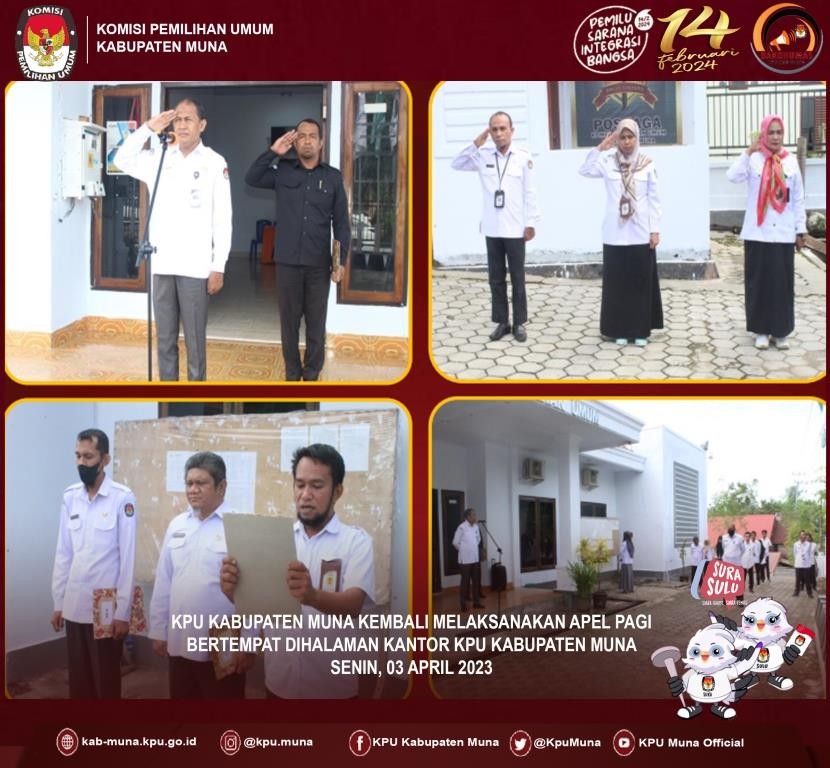 Pada Apel Pagi tersebut, Sekretaris KPU Kabupaten Muna, Halisi Menjadi Pembina Apel. Dalam menyampaikan arahannya sebagai Pembina Apel, Halisi menyampaikan beberapa hal diantaranya Penyaluran Honor dan Operasional Badan Ad Hoc agar segera diselesaikan, persiapan pelaksanaan melakukan Rapat Pleno Terbuka Rekapitulasi Daftar Peilih Hasil Pemutakhiran (DPHP) dan Penetapan Daftar Pemilih Sementara (DPS) dan surat Panggilan bagi anggota badan Adhoc yang mengudurkan diri karena akan dilakukannya klarifikasi terkait penguduran dirinya. Selain itu, Halisi Juga mengingatkan kepada seluruh pegawai KPU Kabupaten Muna untuk selalu memperhatikan setiap Tahapan Pemilu yang sedang berlangsung, sehingga tahapan tersebut tidak ada yang terlewatkan. Terkait tahapan Verifikasi Faktual Perbaikan ke-2 Bakal Calon Anggota DPD. Hasili berharap agar verifikasi tersebut terus dikontrol, dijaga dan diselesaikan sampai dengan batas waktu yang telah ditentukan.