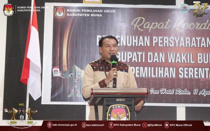 #TemanPemilih. Komisi Pemilihan Umum Kabupaten Muna melaksanakan Rapat Koordinasi Pemenuhan Persyaratan Calon Bupati dan Wakil Bupati Kabupaten Muna pada Pemilihan Serentak Tahun 2024 di Aula Hotel Nes Inn Raha, Minggu (11/08/2024). Rapat koordinasi tersebut diselenggarakan dengan didasarkan pada Peraturan KPU nomor 8 Tahun 2024 tentang Pencalonan Gubernur dan Wakil Gubernur, Bupati dan Wakil Bupati serta Walikota dan Wakil Walikota dan Keputusan Komisi Pemilihan Umum Nomor 1090 Tahun 2024 tentang Pedoman Teknis Pemeriksaan Kesehatan Dalam Pemilihan Gubernur dan Wakil Gubernur, Bupati dan Wakil Bupati, serta Walikota dan Wakil Walikota Tahun 2024. Peserta pada rapat koordinasi tersebut terdiri dari Partai Politik Peserta Pemilu Tahun 2024 tingkat Kab. Muna, Bawaslu Kab. Muna, Lembaga Pemantau, Polres Muna, Kejaksaan Negeri Muna, Pengadilan Negeri Raha, Dinas Kesehatan Kab. Muna, Rutan Kelas IIB Raha, Badan Kepegawaian dan Pengembangan Sumber Daya Manusia, UPTD Dinas Pendidikan Prov. Sultra Cabang Raha, Badan Narkotika Kabupaten Muna, dan RSUD dr.L.M Baharudin, M.Kes Kab. Muna. Turut hadir juga Ketua dan Anggota KPU Kabupaten Muna, Sekretaris KPU Kabupaten Muna dan Jajaran Kasubag Sekretariat KPU Kab. Muna. Ketua KPU Kabupaten Muna, La Ode Muhamad Askar Adi Jaya pada sambutannya di rapat koordinasi itu menyampaikan bahwa KPU Kabupaten Muna telah selesai melaksanakan Rapat Pleno Penetapan Daftar Pemilih Sementara (DPS) dan dalam waktu dekat akan dilaksanakan Rapat Pleno DPS di Prov. Sulawesi Tenggara. Ketua KPU Muna juga menambahkan terkait jadwal pendaftaran pasangan Calon Bupati dan Wakil Bupati sesuai dengan Peraturan KPU Nomor 8 Tahun 2024 dimulai pada tanggal 27 Agustus sampai dengan 29 Agustus 2024. #KPUMelayani #PilkadaSerentak2024