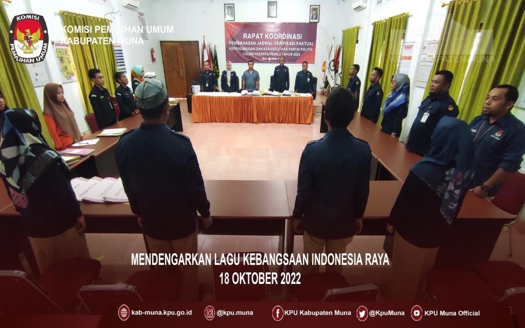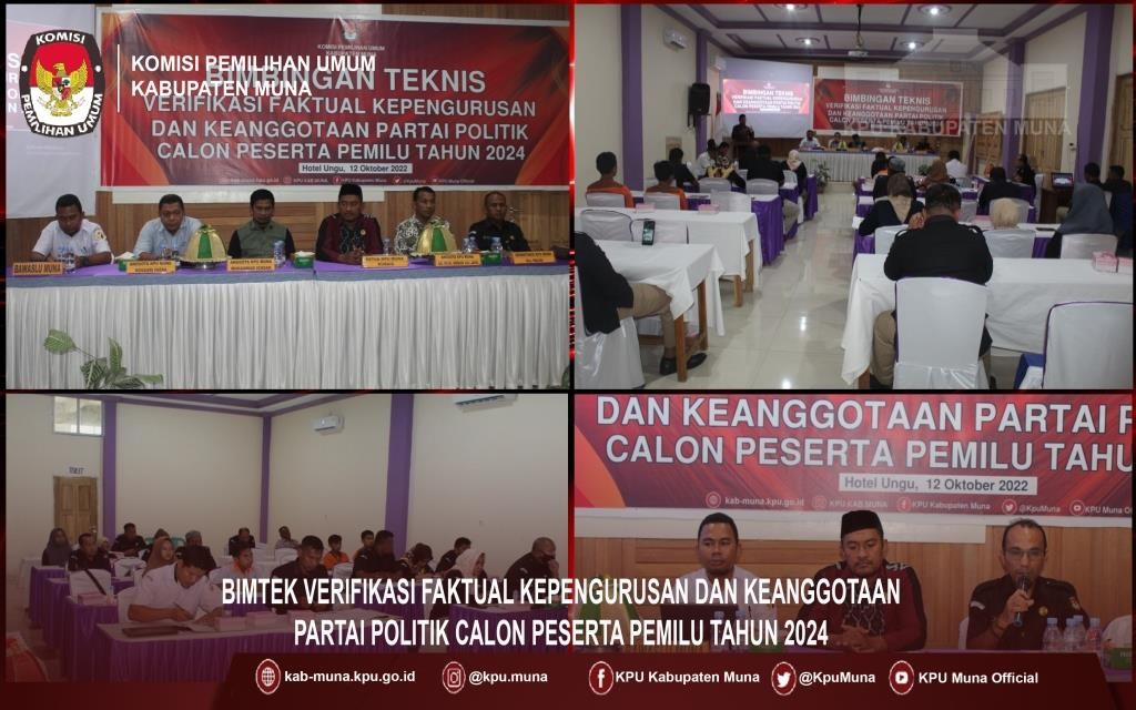 Bakohumas KPU Kabupaten Muna. #TemanPemilih – Rabu (12/10/2022), Komisi Pemilihan Umum Kabupaten Muna Melaksanakan Kegiatan Bimbingan Teknis (Bimtek) Verifikasi Faktual Kepengurusan dan Keanggotaan Partai Politik Calon Peserta Pemilu Tahun 2024. Bimtek yang dilaksanakan di Hotel Ungu Raha Kabupaten Muna tersebut turut dihadiri oleh Bawaslu Muna, Kapolres Muna, Dandim 1416 Muna dan KesbangPol Kabupaten Muna. Bimtek dimulai pada puku 10.00 Wita yang dibuka langsung oleh Ketua KPU Kabupaten Muna, Kubais. Pada kegiatan Bimtek tersebut, pejabat struktural dan Staf PNS Sekretariat KPU Kab. Muna serta Staf PPNPN Sekretariat KPU Kabupaten Muna yang ditugaskan oleh Sekretaris KPU Kab. Muna menjadi peserta Bimtek. Pelaksanaan Bimtek bertujuan untuk menyelenggarakan pelatihan dan memberikan pengetahuan kepada peserta Bimtek khususnya dalam rangka pelaksanaan verifikasi Faktual Kepengurusan dan Keanggotaan Partai Politik Calon Peserta Pemilu Tahun 2024. #KPUMelayani #PemiluSerentak2024