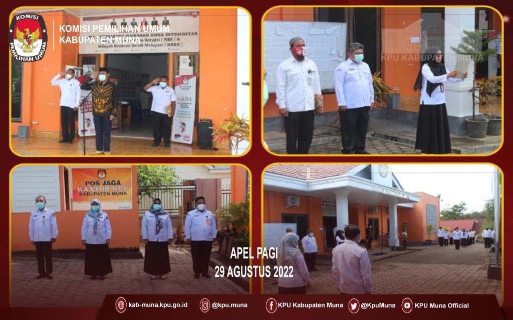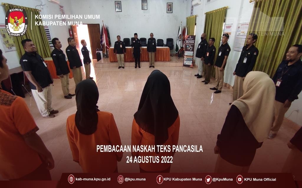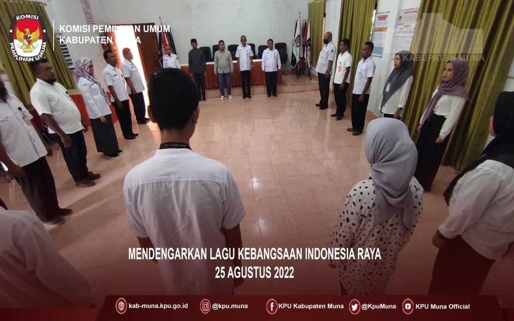 Bakohumas KPU Kabupaten Muna. #TemanPemilih – Tepat Pukul 10.00 Wita, Jajaran KPU Kabupaten Muna menghentikan sejenak seluruh aktifitasnya untuk melaksanakan kegiatan mendengarkan Lagu Kebangsaan Indonesia Raya yang bertepat di Aula Lantor KPU Kabupaten Muna, Kamis (25//08/2022).