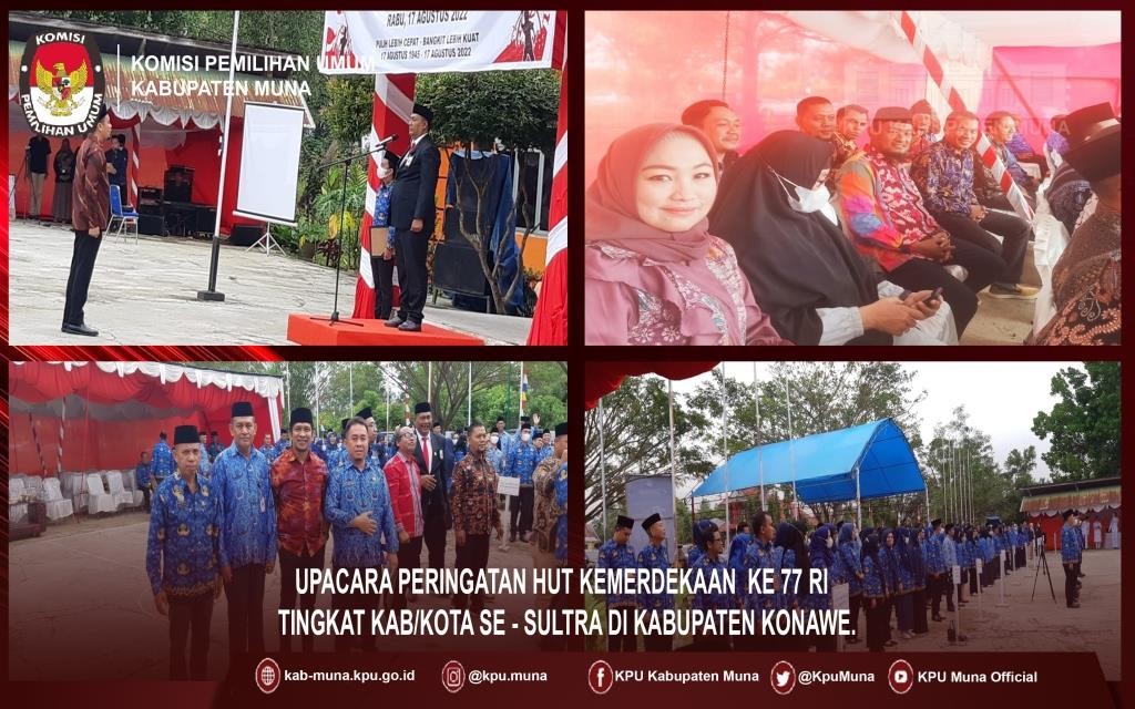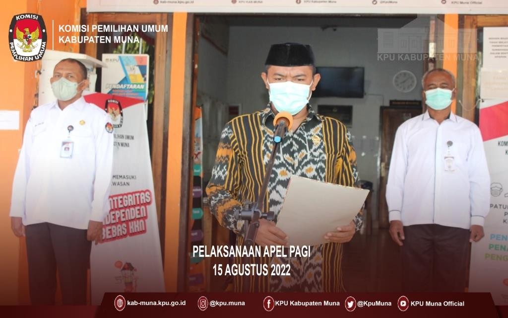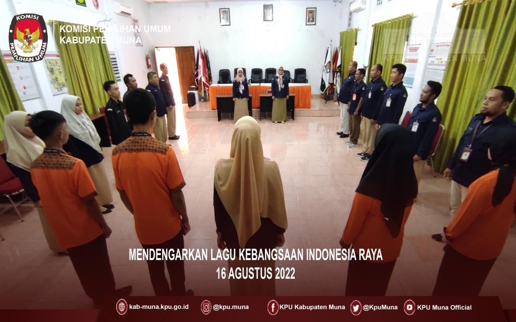 Bakohumas KPU Kabupaten Muna. #TemanPemilih – Menindaklanjuti Surat Edaran KPU RI Nomor 604/SDM.03.5-SD/05/KPU/VI/2021, KPU Kabupaten Muna melaksanakan kegiatan mendengarkan lagu kebangsaan Indonesia Raya yang bertempat di Aula Kantor KPU Kabupaten Muna. Kegiatan tersebut merupakan kegiatan rutinitas KPU yang dilaksanakan setiap hari Selasa dan Kamis setiap Minggunya. Kegiatan yang dilaksanakan tepat pukul 10.00 Wita itu didiikuti oleh Jajaran Kasubag, staf-staf sekretariat KPU Kabupaten Muna baik ASN maupun Non-ASN dan siswa- siswi SMK yang sedang melaksanakan Prakterk Kerja Lapangan (PKL) di kantor KPU Kabupaten Muna, Selasa (16/08/2022). Dengan memperdengarkan lagu Kebangsaan Indonesia Raya setiap minggunya diharapkan dapat menjaga dan meningkatkan rasa kebangsaan dan cinta tanah air, pengabdian terhadap negara dan rakyat Indonesia, serta ketaatan terhadap ideolagi Pancasila dan Undang – Undang Dasar Negara Republik Indonesia Tahun 1945. #KPUMelayani #PemiluSerentak2024Siap