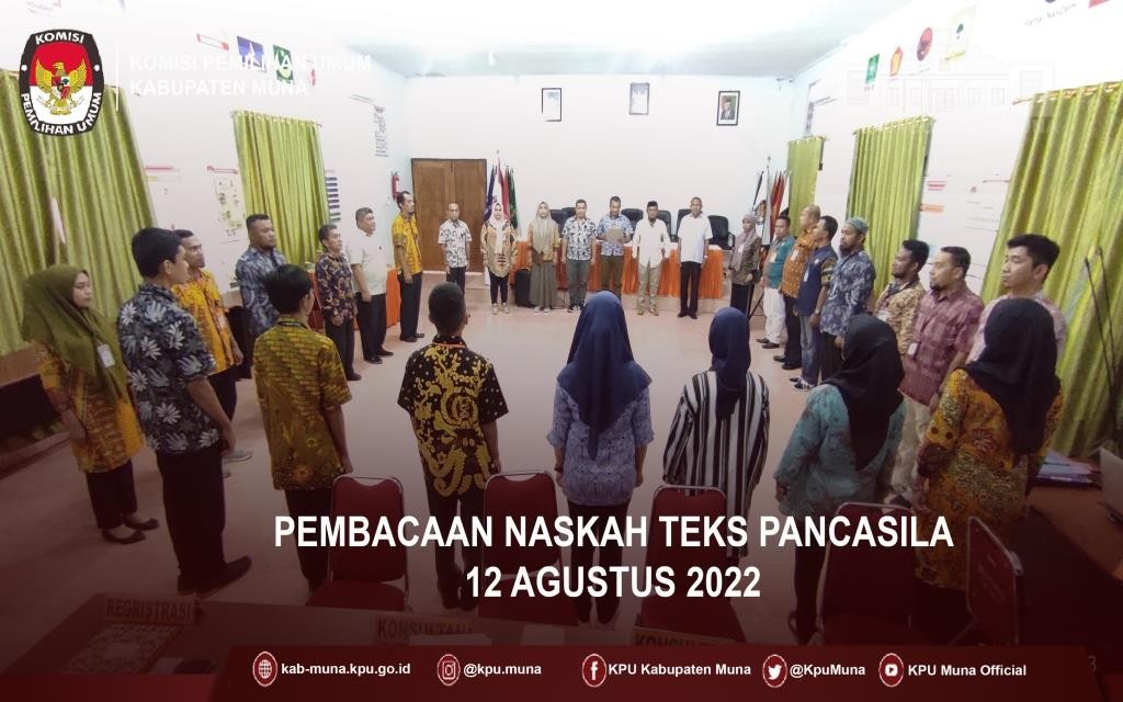 Kegiatan tersebut dilaksanakan di ruangan Aula Kantor KPU kabupaten Muna yang diikuti oleh Ketua KPU Kab. Muna, Kubais, Anggota KPU Koordinator divisi Perencanaan, Data dan Informasi, Yuliana Rita, Anggota KPU Kab. Muna Koordinator Divisi Sosialisasi, Pendidikan Pemilih, Partisipasi Masyarakat dan SDM, Nggasri Faeda, Sekretaris KPU Kab. Muna, Halisi dan Jajaran kasubag KPU Kab. Muna. Kegiatan itu juga diikuti oleh staf – Staf Sekretariat KPU Kab. Muna dan siswa-siswa SMK yang melaksanakan Praktek Kerja Lapangan (PKL) di Kantor KPU Kab. Muna. Teks Pancasila dibancakan oleh Anggota KPU Kab. Muna Koordiantor divisi Hukum dan Pengawasan, La Ode Muhammad Askar Adi Jaya, Jumat (12/08/2022)
