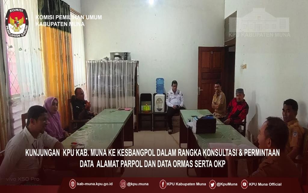 Bakohumas KPU Muna - #TemanPemilih. Selasa (02/08/2022), Ketua KPU Kab. Muna Kubais bersama anggota KPU Muna Yuliana Rita, Nggasri Faeda dan Muhammad Ichsan serta di dampingi oleh Kasubag Teknis Penyelenggaraan Pemilu, Partisipasi dan Humas Sarus melakukan kunjungan audiensi ke Kantor Badan Kesatuan Bangsa dan Politik Kabupaten Muna. Dalam kesempatan itu KPU Kab. Muna diterima oleh Kepala Bidang Ketahanan Ekonomi, Sosial, Budaya, Agama dan Ormas Fahamuddin, S.Sos didampingi oleh Kepala Sub Bidang Pendidikan Politik dan Peningkatan Demokrasi La Ode Muhammad Asrun, SH. Kunjungan audiensi ini dalam rangka koordinasi permintaan data dan alamat Ormas dan OKP yang terdaftar di Badan Kesbangpol Kab. Muna serta sinkronisasi data alamat Kantor Partai Politik yang berada di wilayah Kabupaten Muna. pada kesempatan tersebut baik Kabid Ketahanan Ekonomi, Sosial, Budaya, Agama dan Ormas maupun Kepala Sub Bidang Pendidikan Politik dan Peningkatan Demokrasi senada menyampaikan data yang dimintakan ada pada Kesbangpol Kab. Muna dan akan memberikan data yang diminta dan secara resmi akan menyampaikannya melalui persuratan membalas surat KPU Muna. Sementara itu Ketua KPU Muna menjelaskan bahwa kepentingan KPU Muna terhadap keberadaan Ormas dan OKP sebagai stakeholder adalah dalam rangka membangun kerjasama, kemitraan dan sinergi untuk suksesnya Pemilu 2024 dan Pemilihan 2024, sementara itu data Partai Politik adalah untuk memastikan keaktifan alamat Partai Politik khususnya Partai Politik baru.