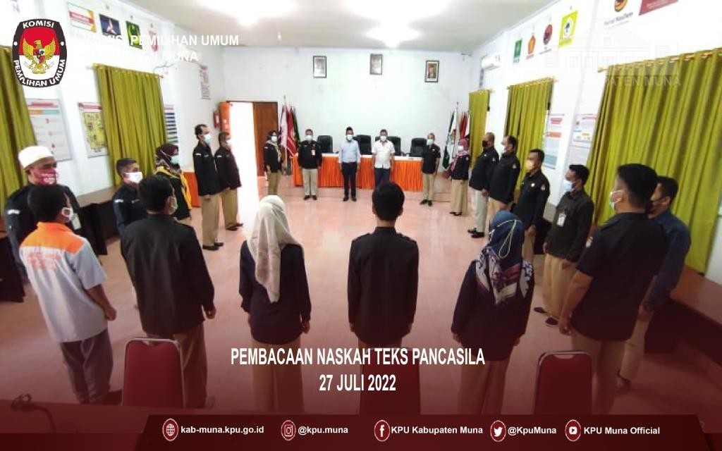 Pelaksanaan kegiatan pembacaan naskah teks pancasila merupakan salah satu realisasi dari surat edaran KPU RI Nomor : 604/SDM.03.5-SD/05/KPU/VI/2021, Perihal Himbauan Pelaksanaan Apel Pagi. Oleh karena itu, kegiatan tersebut menjadi kegiatan rutinitas KPU Kabupaten Muna yang dilaksanakan dihari Rabu dan Jumat setiap minggunya.