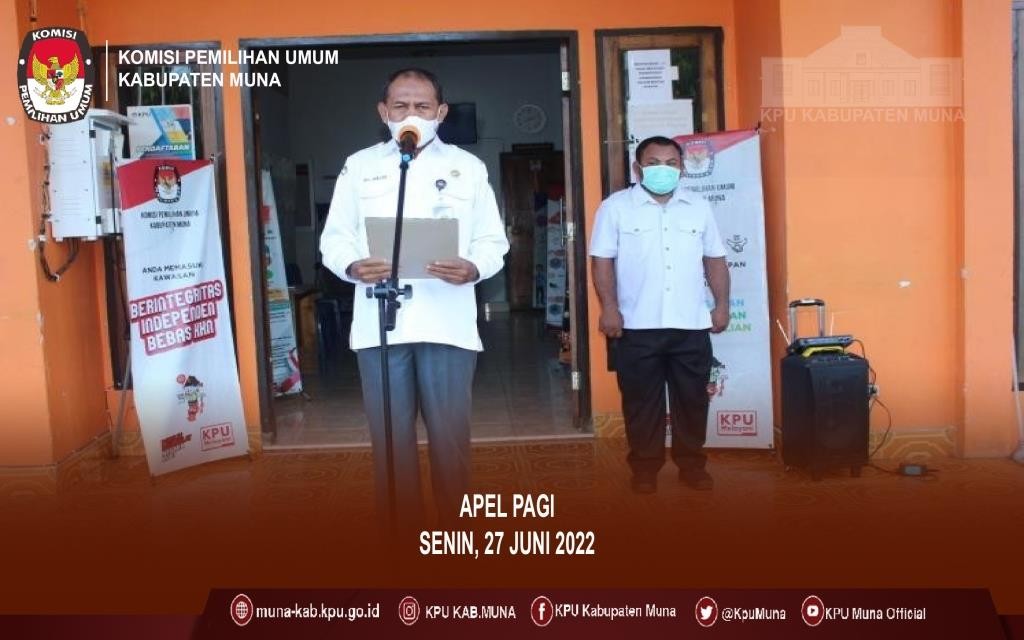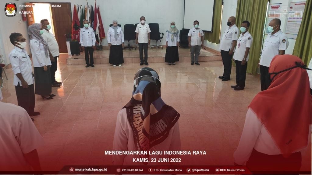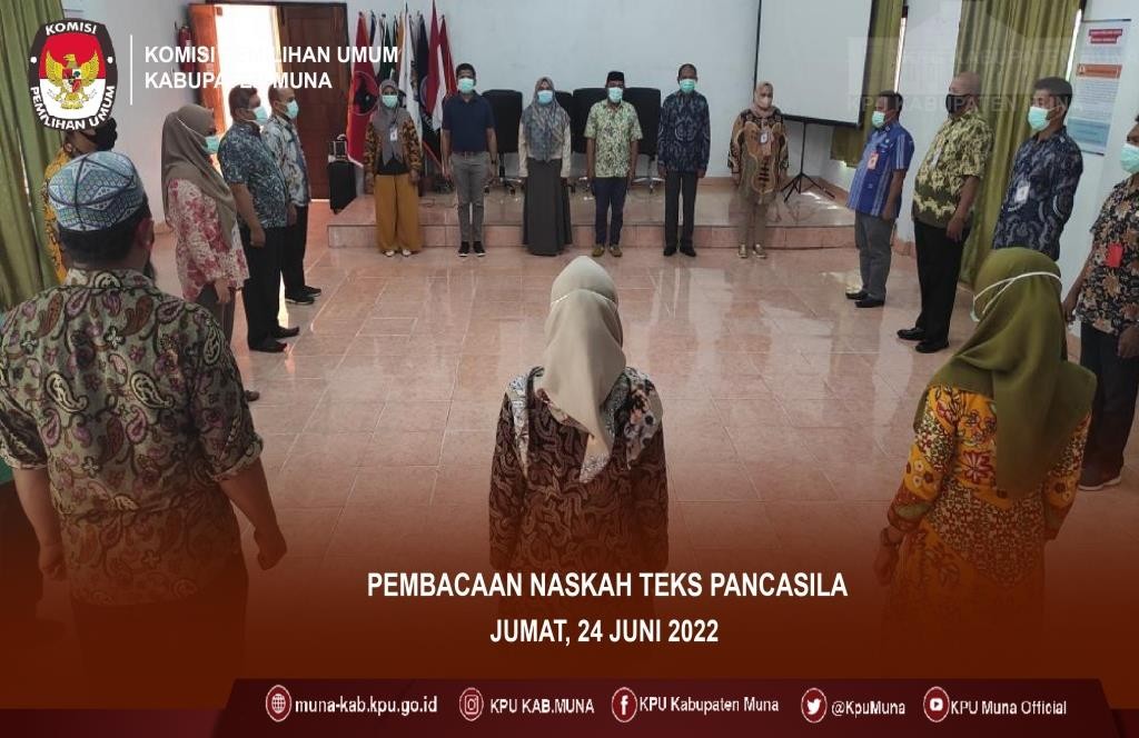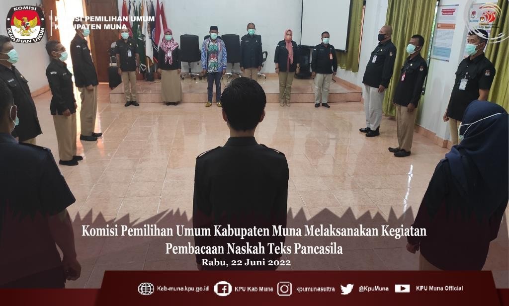 kab-muna.kpu.go.id. Bakohumas KPU Kab. Muna - #TemanPemilih. Jumat (24/06/2022), Komisi Pemilihan Umum (KPU) Kabupaten Muna melaksanakan kegiatan Pembacaan Naskah Teks Pancasila. Kegiatan tersebut merupakan kegiatan rutinitas KPU yang dilaksanakan setiap hari Rabu dan Jumat sesuai Surat Edaran KPU RI Nomor : 604/SDM.03.5-SD/05/KPU/VI/2021, Perihal Himbauan Pelaksanaan Apel Pagi. Hari ini kegiatan itu dilaksanakan di ruangan Aula Kantor KPU kabupaten Muna. Kegiatan tersebut diikuti oleh Anggota KPU masing-masing Koordinator Divisi Perencanaan, Data dan Informasi, Yuliana Rita dan Koordinator Tehnis Penyelenggaraan, Muhammad Ichsan. Kegiatan itu juga diikuti oleh Sekretaris, Jajaran kasubag serta Staf Sekretariat KPU Kabupaten Muna. Pada kegiatan itu, Teks Pancasila dibancakan oleh Ketua KPU Kabupaten Muna, Kubais. Kegiatan Pembacaan Naskah Teks Pancasila itu dimaksudkan meningkatkan semangat ideologi Pancasila dan Undang-Undang Dasar 1945 seluruh jajaran KPU Kabupaten Muna serta menjadi salah satu langkah dalam rangka memelihara dan meningkatkan rasa kebangsaan dan cinta tanah air, pengabdian kepada negara dan rakyat Indonesia. #KPUMelayani #PemiluSerentak202