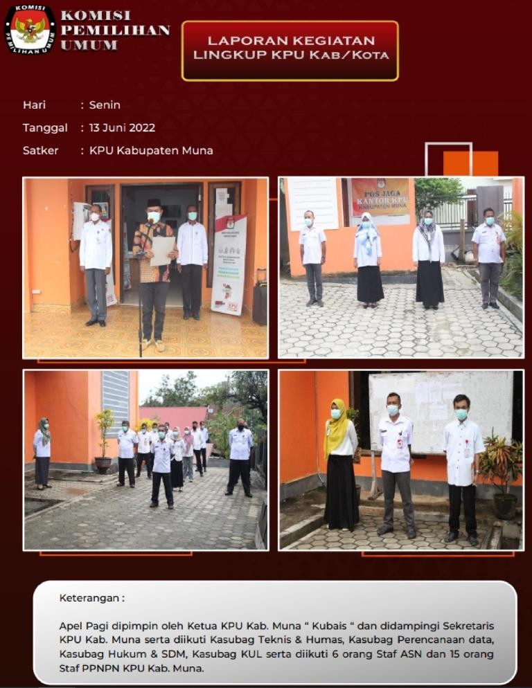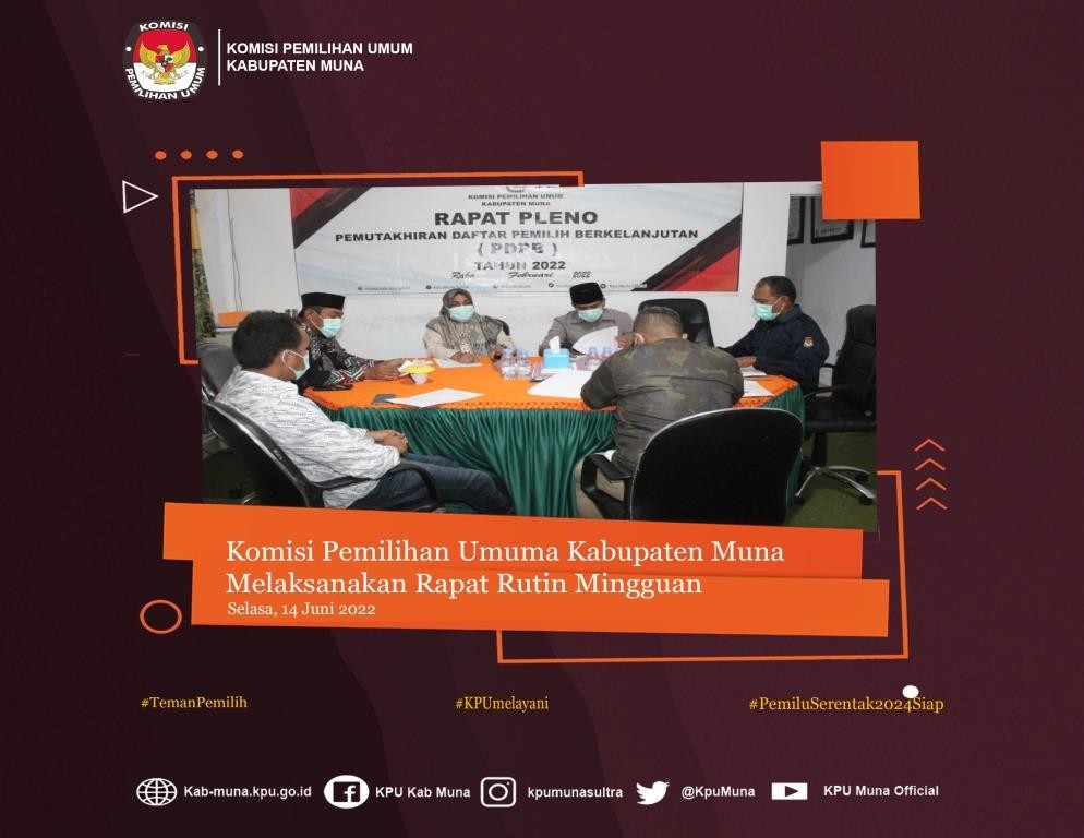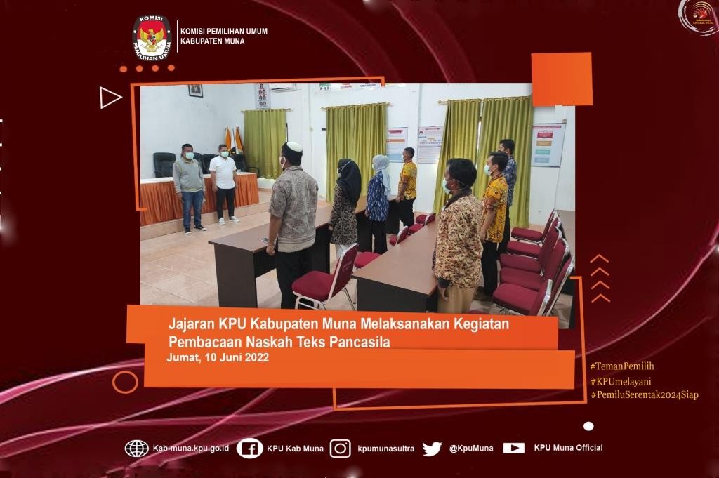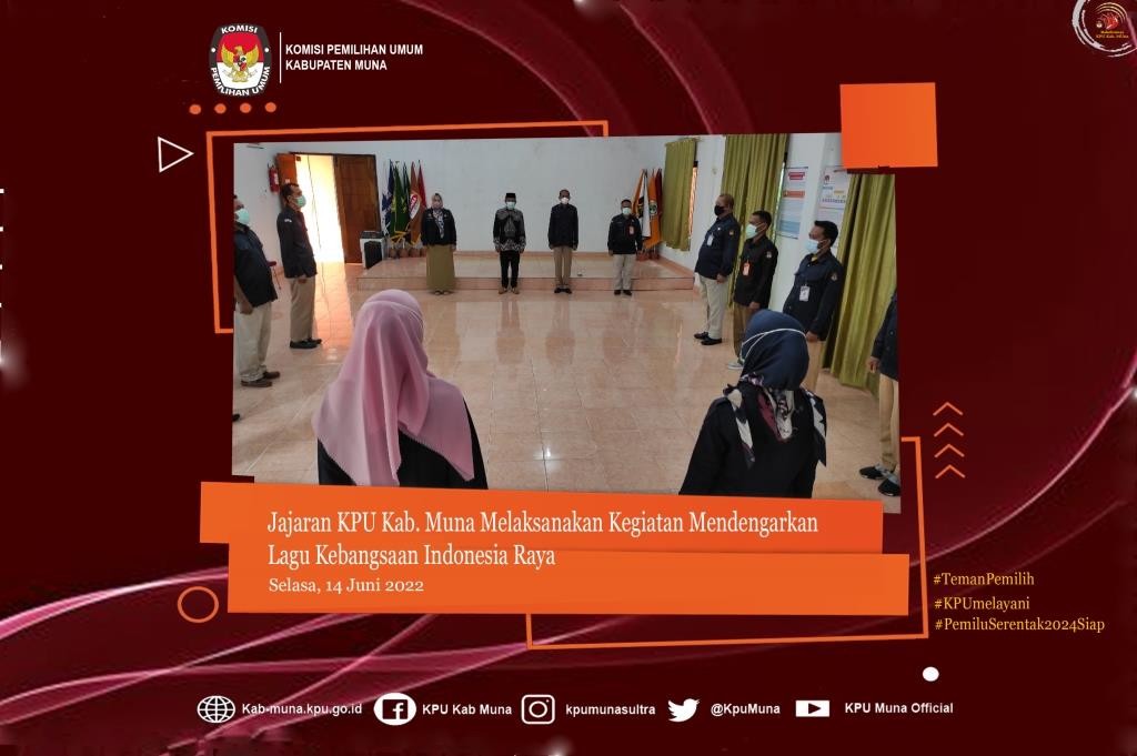 kab-muna.kpu.go.id - #TemanPemilih. Tepat pukul 10.00 Wita, Jajaran Komisi Pemilihan Umum (KPU) Kabupaten Muna menghentikan sejenak seluruh aktivitasnya untuk mengikuti kegiatan mendengarkan lagu Kebangsaan Indonesia Raya. Kegiatan tersebut bertujuan untuk menjaga dan meningkatkan rasa kebangsaan dan cinta tanah air, pengabdian terhadap negara dan rakyat Indonesia, serta ketaatan terhadap ideolagi Pancasila dan Undang – Undang Dasar Negara Republik Indonesia Tahun 1945, Selasa (14/06/2022). Kegiatan mendengarkan lagu Indonesia Raya Merupakan realisasi dari Surat Edaran KPU RI Nomor : 604/SDM.03.5-SD/05/KPU/VI/2021 Perihal Himbauan Pelaksanaan Apel Pagi, dan Mendegarkan Lagu Kebangsaan Indonesia Raya merupakan salah satu bentuk kegiatan yang diatur dalam Surat Edaran tersebut. Kegiatan yang bertempat di Aula Kantor KPU Kab. Muna itu diikuti oleh ketua KPU Kabupaten Muna, Kubais, S.Pd.,M.Pd dan didampingi oleh sekretaris KPU Muna, Drs. Halisi serta Jajaran Kaubag KPU Kabupaten Muna. Kegiatan itu juga diikuti oleh seluruh staf-staf sekretariat KPU Muna baik ASN maupun Non-ASN. Peserta yang ikut dalam kegiatan tersebut berdiri dengan sikap yang sempurna sebagai bentuk penghormatan saat mendengarkan lagu Kebangsaan Indonesia raya. Diharapkan dengan memperdengarkan lagu Kebangsaan Indonesia Raya setiap minggunya dapat menjaga dan meningkatkan rasa kebangsaan dan cinta tanah air, pengabdian terhadap negara dan rakyat Indonesia, serta ketaatan terhadap ideolagi Pancasila dan Undang – Undang Dasar Negara Republik Indonesia Tahun 1945. #KPUMelayani #PemiluSerentak2024
