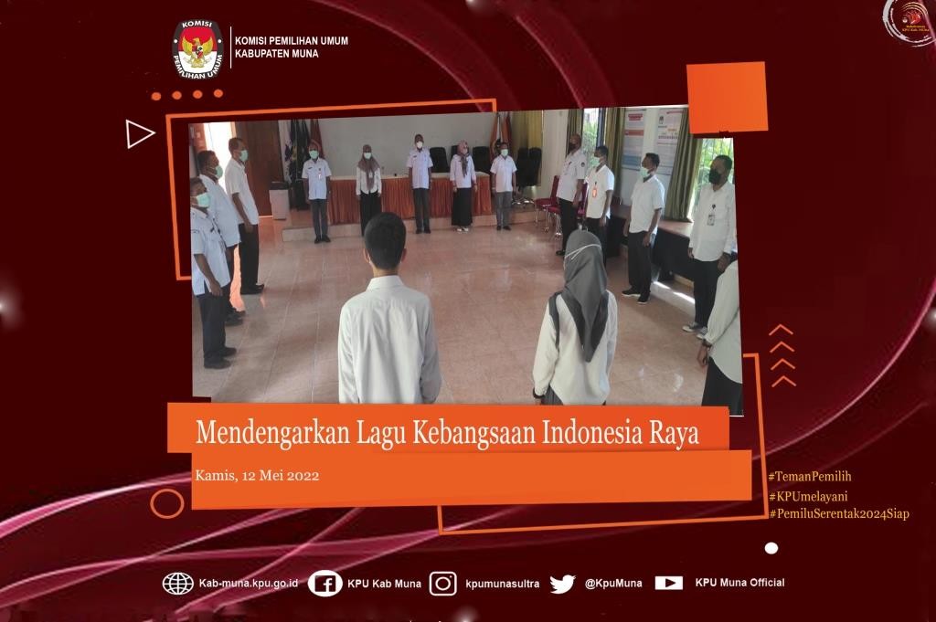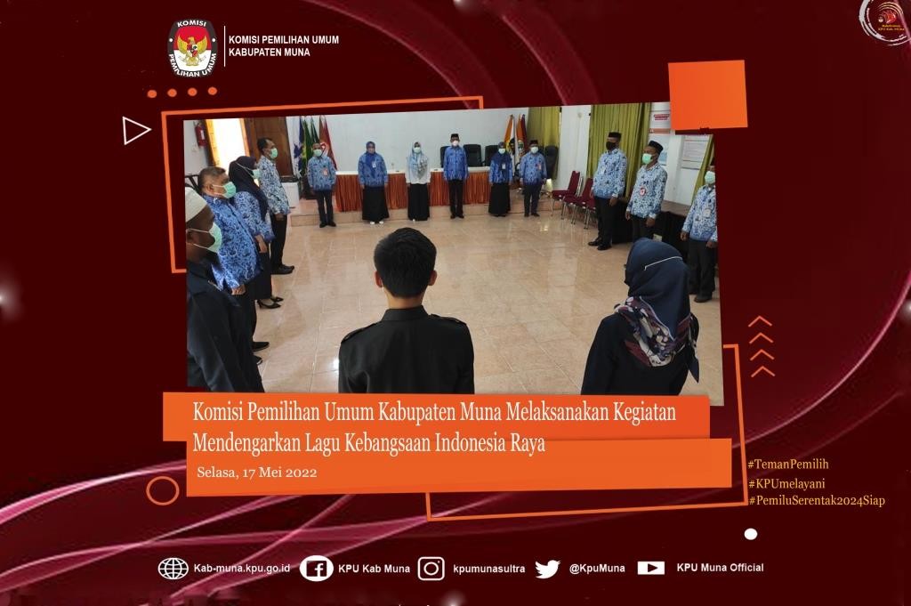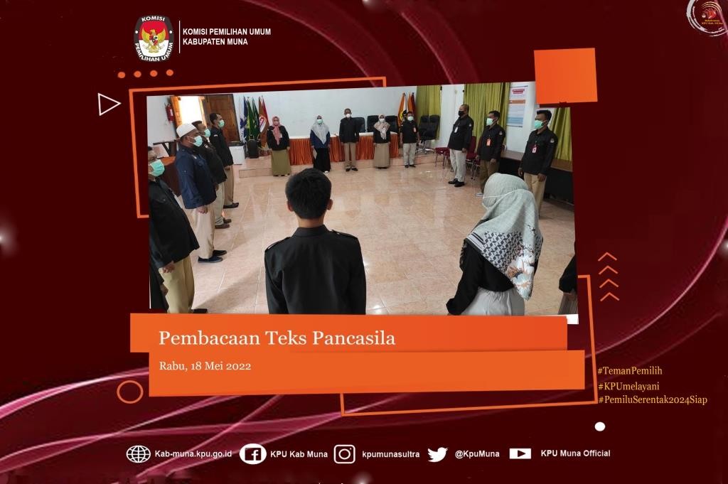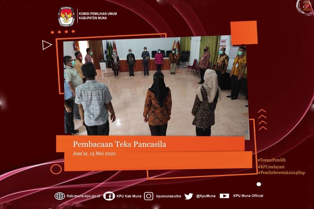 #TemanPemilih kab.muna.kpu.go.id - Tepat pukul 10.00 Wita, Jajaran Komisi Pemilihan Umum (KPU) Kabupaten Muna menghentikan sejenak seluruh aktivitasnya untuk mengikuti kegiatan rutin yang dilaksanakan setiap hari Rabu dan Jumat yaitu Pebacaan Naskah Teks Pancasila. Hari ini (Rabu, 18/05/2022), Jajaran KPU kab. Muna Kembali Melaksanakan kegiatan tersebut. Naskah Teks Pancasila dibacakan oleh Anggota KPU Muna Divisi Perencanaann Data dan Informasi, Yuliana Rita, S.Hut. Kegiatan yang bertempat di Aula Kantor KPU Kabupaten Muna ini diikuti oleh Sekretaris KPU Kab. Muna Drs. Halisi dan Jajaran Kasubag Sekretariat KPU Kab. Muna serta para Staf KPU Kab. Muna baik yang ASN maupun PPNPN. Pembacaan Naskah Pancasila dilaksanakan untuk mewujudkan semangat ideologi Pancasila dan Undang-Undang Dasar 1945 seluruh jajaran KPU Kabupaten Muna serta menjadi salah satu langkah dalam rangka memelihara dan meningkatkan rasa kebangsaan dan cinta tanah air, pengabdian kepada negara dan rakyat Indonesia. #KPUMelayani #PemiluSerentak2024