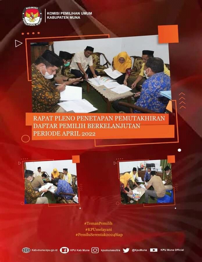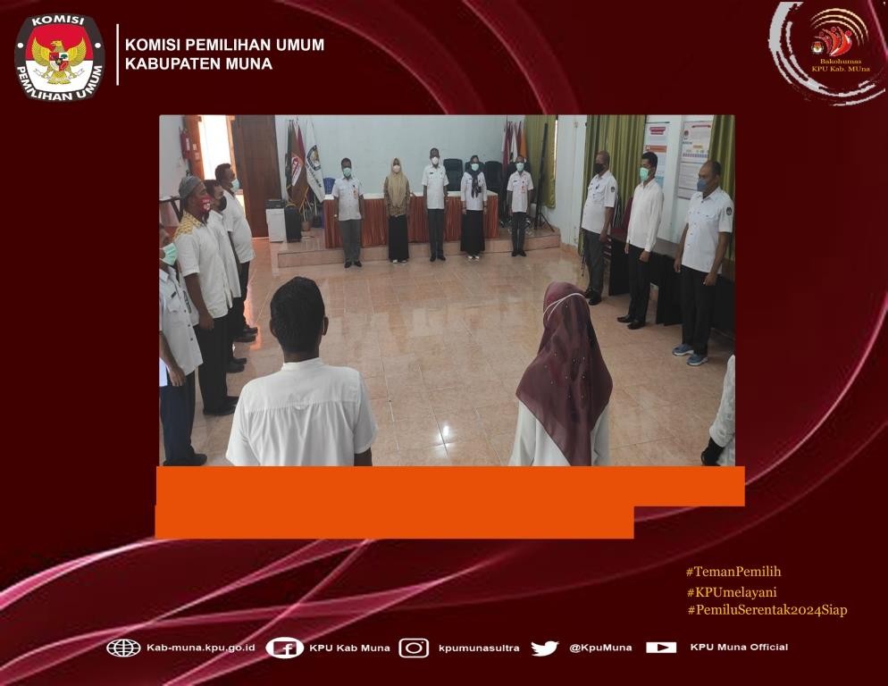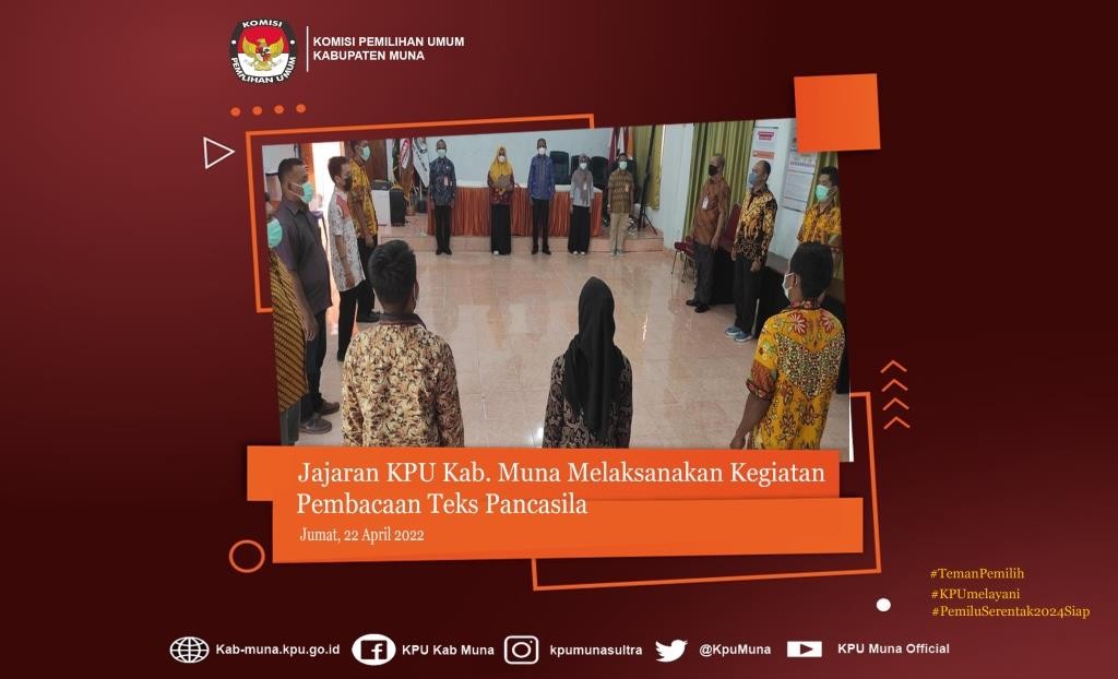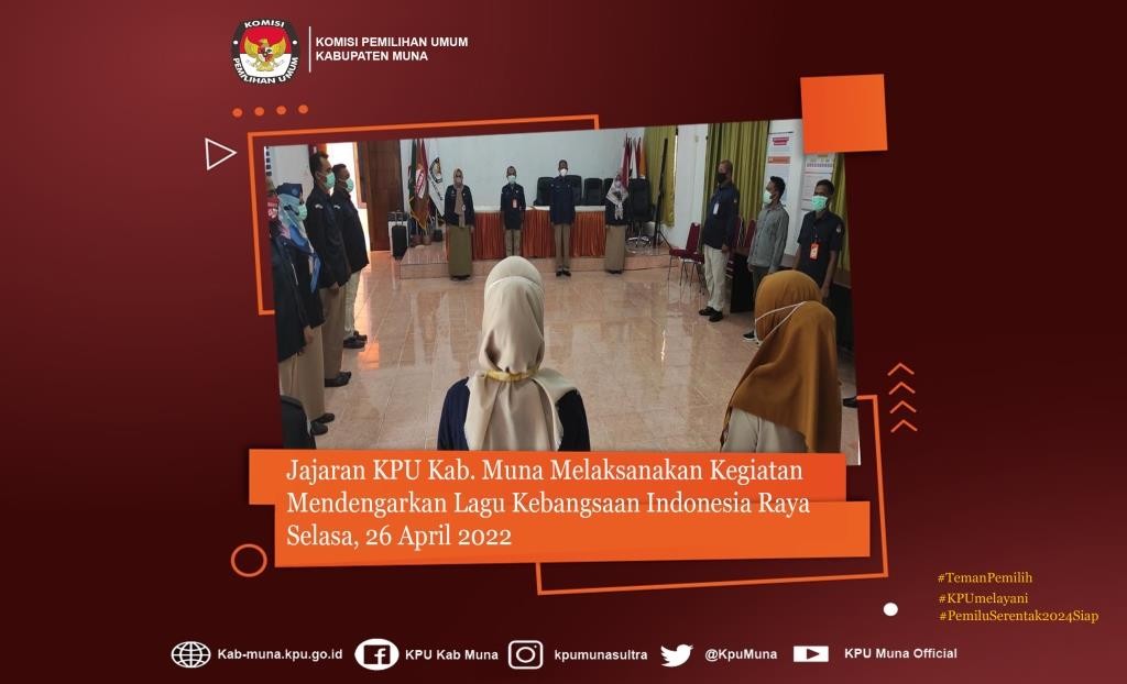 #TemanPemilih Raha. kab-muna.kpu.go.id – Jajaran Komisi Pemilihan Umum (KPU) Kabupaten Muna melaksanakan kegiatan mendengarkan lagu kebangsaan Indonesia raya. Kegiatan yang dimulai pada pukul 10.00 WITA dan dilaksanakan di Aula Kantor KPU Kabupaten Muna ini dihadiri oleh sekretaris KPU Kab. Muna, Drs. Halisi dan didampingi oleh Jajaran kasubag sekretariat KPU Kab. Muna. Kegiatan ini juga diikuti oleh seluruh Staf sekretariat KPU Kab. Muna. Setiap orang yang mendengar lagu kebangsaan Indonesia Raya berdiri dengan sikap sempurna sebagai penghormatan dan ikut menyanyikan lagu Kebangsaan Indonesia Raya, Selasa (26/04/2022). Kegiatan mendengarkan lagu kebangsaan Indonesia raya ini telah menjadi kegiatan rutin KPU Kab. Muna yang dilaksanakan setiap hari selasa dan kamis setiap minggunya. Hal ini berdasarkan Surat Edaran KPU RI Nomor 604/SDM.03.5-SD/05/KPU/VI/2021 Tanggal 30 Juni 2021, perihal himbauan pelaksanaan apel pagi. Dengan memperdengarkan lagu Kebangsaan Indonesia Raya setiap minggunya diharapkan dapat menjaga dan meningkatkan rasa kebangsaan dan cinta tanah air, pengabdian terhadap negara dan rakyat Indonesia, serta ketaatan terhadap ideolagi Pancasila dan Undang – Undang Dasar Negara Republik Indonesia Tahun 1945. #KPUmelayani #PemiluSerentak2024Siap