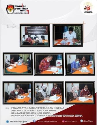 #TemanPemilih. Dalam rangka mewujudkan manajemen pemerintah yang efekif, transparan, dan akuntabel serta berorientasi pada hasil, di Tahun 2022 Komisi Pemilihan Umum Kabupaten Muna telah melaksanakan Perjanjian Kinerja antara Ketua KPU Kab. Muna dan Sekretaris KPU Kab. Muna serta antara Sekretaris KPU Kab. Muna dengan para Kasubag KPU Kab. Muna. Sasaran strategis KPU Kab. Muna yang ingin dicapai pada Tahun 2022 meliputi: 1) Tersusunnya Dokumen Perencanaan Program dan Anggaran; 2) Tersusunnya Dokumen Peraturan Pelaksanaan Penyelenggaraan Pemilu; 3) Terlaksananya Pendaftaran, Verifikasi, dan Penetapan Peserta Pemilu; 4) Terlaksananya sistem akuntansi dan pelaporan keuangan; 5) Tersusunnya laporan pertanggungjawaban penggunaan anggaran; 6) Terlaksananya Pembayaran Gaji dan Tunjangan yang tepat waktu; 7) Terwujudnya Pengelolaan Barang Milik Negara berdasarkan SAP; dan Teruvujudnya Data Pemilih secara Berkelanjutan Pelaksanaan sasaran strategis tersebut diikuti dengan target persentasi capaian yang akan diukur pencapainnya setiap semester dan diakumulasi di akhir tahun. Pada kesempatan penandatanganan Perjanjian Kinerja ini Ketua KPU Muna, Kubais menekankan kepada seluruh jajarannya melalui Sekretaris dan para Kasubag agar serius dan bekerja secara profesional dalam mengoperasionalkan sasaran kinerja tersebut dengan merumuskan rencana aksi atas setiap program dan kegiatan dan mengoptimalkan penggunaan anggaran guna mencapai target maksimal di akhir tahun anggaran, tapi harus memperhatikan prinsip transparansi dan akuntabilitas serta tidak menimbulkan kerugian negara, tegas Kubais. Sementara itu Sekretaris KPU Muna, Drs .Halisi bersama jajarannya para Kasubag menyatakan akan mewujudkan target kinerja sebagaimana yang telah direncanakan. #KPUMunaMelayani #PemilihanSerentakTahun 2024