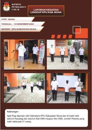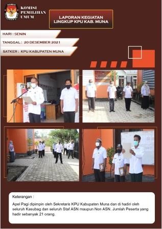 #TemanPemilih, Senin (20/12/2021) jajaran KPU Kabupaten Muna melaksanakan Apel pagi di halamam kantor KPU Kabupaten Muna, apel di pimpin langsung oleh Sekretaris KPU Kabupaten Muna Bapak Drs. Halisi diikuti oleh Para Kasubag, dan Seluruh staf. dalam amanatnya beliau menyampaikan tetap menjaga disiplin yang selama ini telah dibangun, setiap Subbag agar memisahkan dokumen-dokumen yang sudh tidak digunakan lagi agar memudahkan bila mana dokumen tersebut dibutuhkan, dan terakhir memberikan apresiasi kepada Kasubbag KUL Bapak Marsaban dan salah satu staf bapak La Ode Poandu yang sebentar lagi akan Purna bakti pada tanggal 31 Desember 2021, walaupun tinggal beberapa hari lagi mereka tetap menjalan tugas.