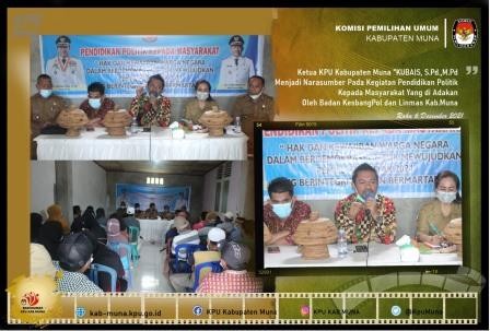 #TemanPemilih, Giat Ketua KPU Muna, Kubais, S. Pd., M. Pd pada hari Senin 6 Desember 2021 menjadi narasumber bersama Ketua Bawaslu Muna Al Abzal Naim, SP., MP pada kegiatan Pendidikan Politik Kepada Masyarakat yang diselenggarakan oleh Badan KesbangPol dan Linmas Kabupaten Muna bertempat di Balai Kelurahan Raha III Kecamatan Katobu. Kegiatan dengan tema " Hak dan Kewajiban Warga Negara Dalam Berdemokrasi Untuk Mewujudkan Pemilu Serentak Tahun 2024 Yang Berintegritas dan Bermartabat" ini dibuka dan dipandu oleh Kabid Politik Dalam Negeri ibu Merry Magdalena Jonas, SH., M. si dengan dihadiri oleh unsur tokoh masyarakat, tokoh agama, tokoh pemuda dan tokoh perempuan. Baik Ketua KPU muna dan Ketua Bawaslu Muna pada kesempatan tersebut menegaskan bahwa sebagai warga negara yang baik maka mempunyai kewajiban berperan aktif dalam pembangunan demokrasi dan memiliki hak yang sama untuk berpartisipasi secara politik dalam menentukan arah dan masa depan bangsa dengan cara menyalurkan hak suaranya pada pemilu dan pemilihan untuk memilih para pemimpin negara dan pemimpin daerah. Sementara itu sebagai warga negara maka harus taat pada azas penyelenggaraan pemilu dan pemilihan sebagaimana tertuang dalam UU No 7 Tahun 2017 dan UU No 10 Tahun 2016 agar terwujud Pemilu dan Pemilihan yang berintegritas dan bermartabat.
