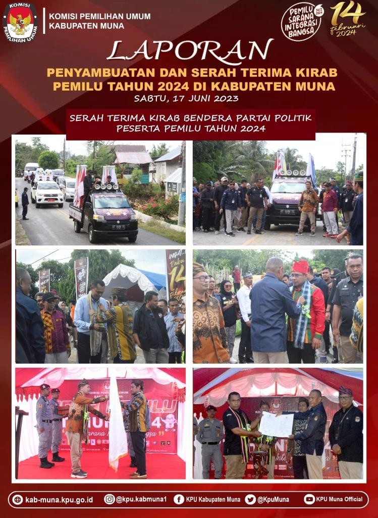 #TemanPemilih. Komisi Pemilihan Umum Kabupaten Muna Melaksanakan Penyambutan dan Serah Terima Kirab Bendera Partai Politik Peserta Pemilu Tahun 2024, Sabtu (17/06/2023). Kirab Pemilu Tahun 2024 diluncurkan secara serentak pada tanggal 14 Februari 2023 pada 7 Titik seluruh Indonesia dan KPU Kabupaten Muna merupakan Rute Jalur VII yang diawali dari Provinsi Papua, kemudian Estafet ke Provinsi Papua Barat, Kemudian lanjut ke Maluku dan Akhirnya tiba di Provinsi Sulawesi Tenggara pada tanggal 11 Juni 2023 dengan titik awal di Kota Bau-Bau. Selanjutnya melalui Jalur Penyebrangan Bau-Bau – Wamengkoli menuju Kabupaten Muna dan pada tanggal 17 Juni 2023 KPU Kabupaten Muna Menerima Estafet Kirab Pemilu Tahun 2024 dari KPU Kabupaten Bau-Bau di Kantor KPU Kabupaten Muna. Kirab Pemilu di Kabupaten Muna akan berlangsung selama 7 Hari hingga tanggal 23 Juni 2023 dan pada Tanggal 23 Juni 2023 KPU Kabupaten Muna akan melanjutkan Estafet Kirab Pemilu kepada KPU Kota Kendari di Kendari. Pada kegiatan penyambutan dan serah terima kirab tersebut KPU Kabupaten Muna beserta jajarannya dan seluruh Badan Ad Hoc KPU Kaupaten Muna menyatakan siap mensukseskan Pelaksanaan Kirab Pemilu Tahun 2024. #KPUMelayani #PemiluSerentak2024